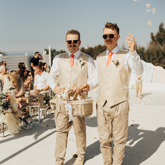 Enter - The flower men. First to walk down the aisle, the brief from the brides was for them to set the tone of the wedding. Wearing Ray Bans and tossing their flower petals "with feeling" to the Top Gun theme tune, they fully understood their mission and broke the ice beautifully. They had even grown moustaches for the part! Now, that's dedication for you!!
